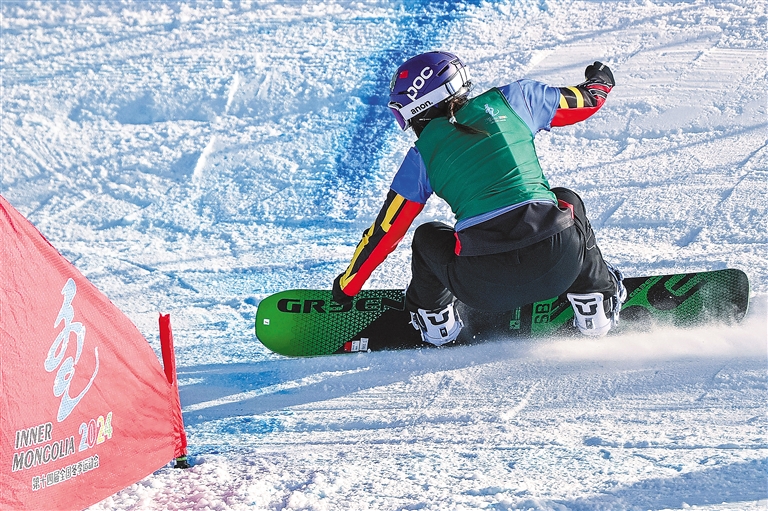 圖為2月19日,在內(nèi)蒙古烏蘭察布市涼城滑雪場(chǎng)舉行的第十四屆全國(guó)冬季運(yùn)動(dòng)會(huì)單板滑雪青年組女子障礙追逐賽中,中國(guó)西藏隊(duì)選手擁青拉姆正在比賽(資料圖片)。新華社記者 伍志尊 攝