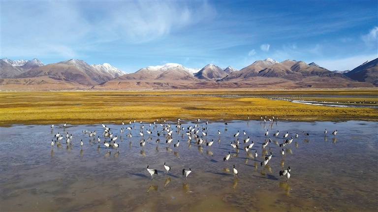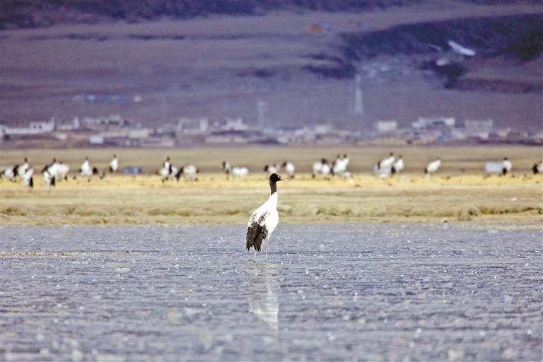 數(shù)量逐年增多的黑頸鶴成群遷徙停歇或繁殖,正是對(duì)當(dāng)雄縣生態(tài)環(huán)境持續(xù)向好的最美注腳。當(dāng)雄縣自然資源局(林業(yè)和草原局)局長(zhǎng)楊光富說(shuō):“近年來(lái),當(dāng)雄縣始終堅(jiān)持‘綠水青山就是金山銀山、冰天雪地也是金山銀山’的發(fā)展理念,率先在拉薩市成功創(chuàng)建全國(guó)生態(tài)文明示范縣和‘兩山’實(shí)踐創(chuàng)新基地。這兩塊金字招牌充分體現(xiàn)了當(dāng)雄的生態(tài)底色。下一步,我們將在全縣草原生態(tài)保護(hù)中重點(diǎn)突出阿熱濕地保護(hù),探索濕地黑頸鶴、斑頭雁等珍稀野生動(dòng)物活動(dòng)的特點(diǎn)規(guī)律,促進(jìn)濕地保護(hù)管理與濕地資源合理利用有機(jī)融合,確保探索形成守綠換金、添綠增金、點(diǎn)綠成金的‘兩山’轉(zhuǎn)化模式?!?/p>