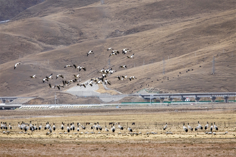 遠(yuǎn)處,有火車沿著青藏鐵路鳴笛經(jīng)過(guò),黑頸鶴們“淡定一瞥”,仿若未聞其聲,繼續(xù)欣賞水中的倒影,于鳥鳴處處、水聲悠悠間自得其樂。當(dāng)然,也有部分遷徙北上的黑頸鶴會(huì)在此安家,孵一窩雛鳥,將這里當(dāng)作它們遷徙的終點(diǎn),開始新的生活。
