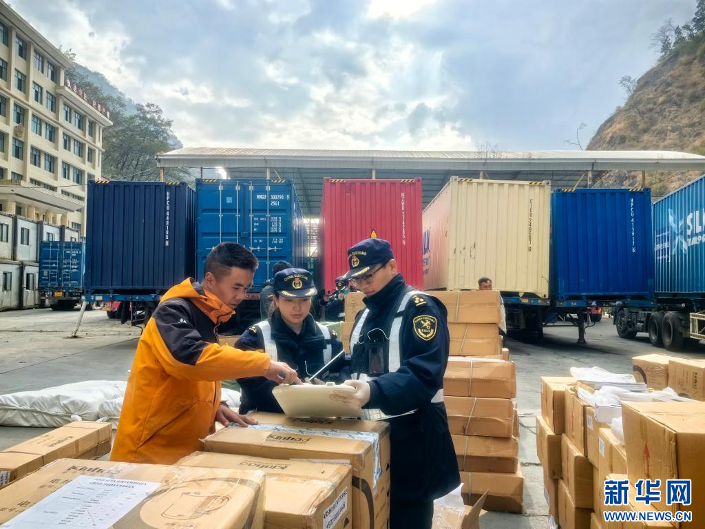 拉薩海關(guān)所屬聶拉木海關(guān)工作人員監(jiān)管進(jìn)出口貨物。(拉薩海關(guān)供圖)