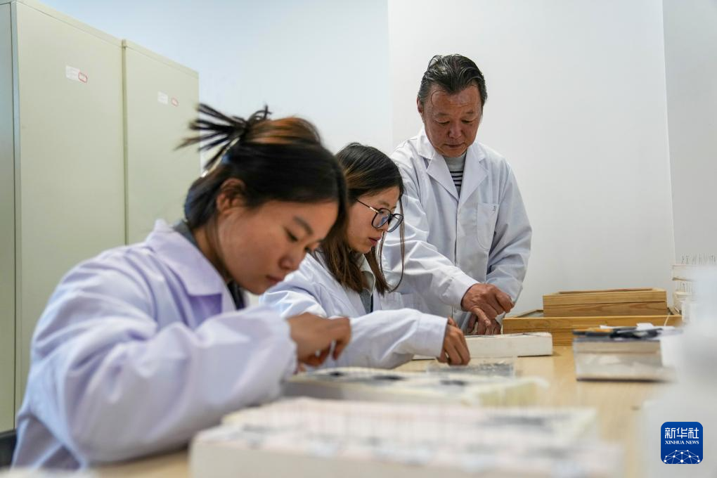 在位于拉薩的西藏自治區(qū)高原生物研究所,達娃(右)輔導(dǎo)學(xué)生制作標(biāo)本(4月22日攝)。新華社記者 旦增尼瑪曲珠 攝
