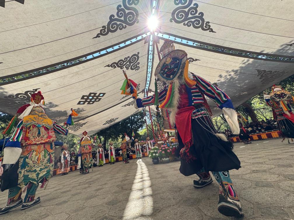 廣場(chǎng)中央戲臺(tái)上,鼓點(diǎn)輕快、鈸聲鏗鏘,戴著黃面白發(fā)面具的藏戲演員唱腔高亢激昂;臺(tái)下,觀眾聚精會(huì)神,不時(shí)隨著演員表演一起大笑。