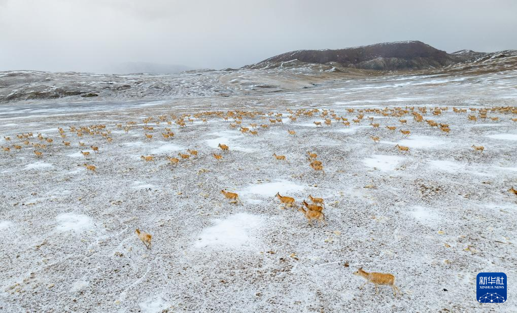 藏羚羊在向產(chǎn)羔地遷徙(無人機(jī)照片,5月10日攝)。新華社記者 姜帆 攝