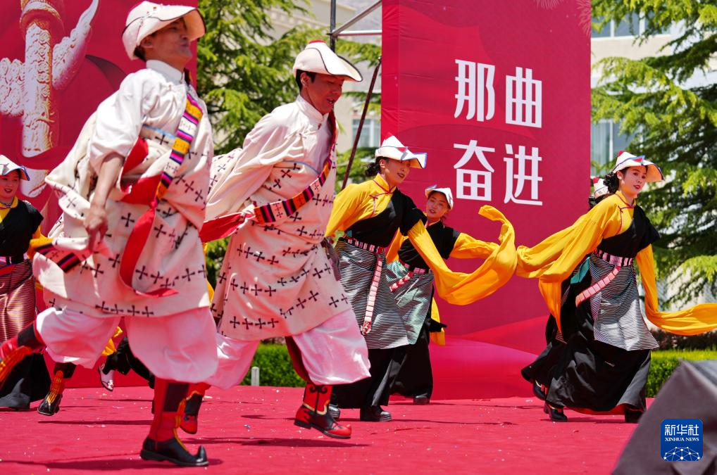 5月12日,在西藏職業(yè)技術(shù)學(xué)院職業(yè)教育活動周啟動儀式暨比如縣非物質(zhì)文化遺產(chǎn)進校園活動上,比如縣民族藝術(shù)團的演職人員在表演節(jié)目。新華社記者 張汝鋒 攝