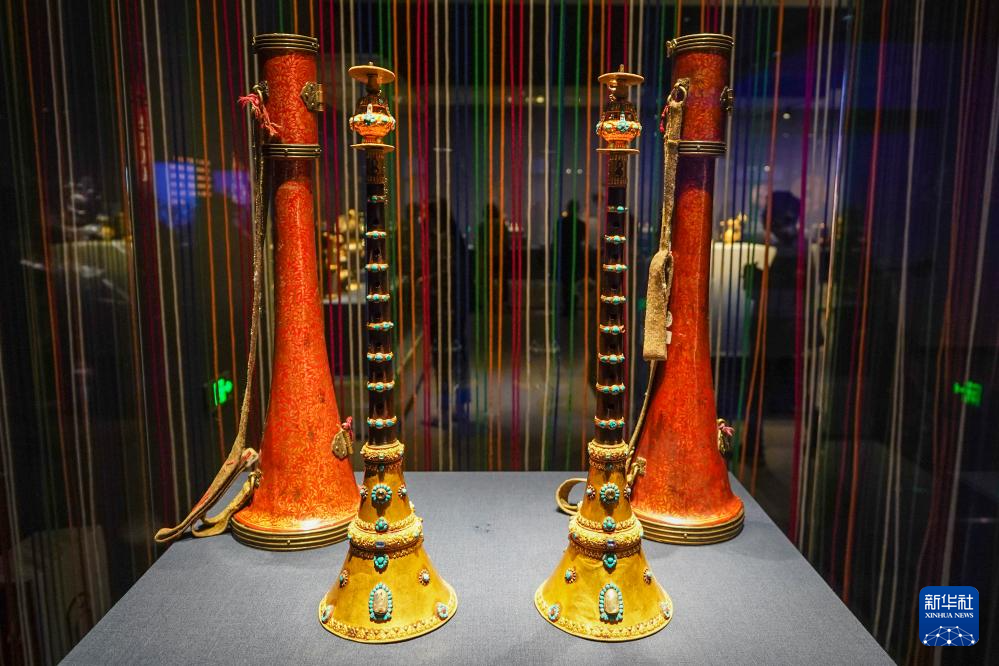 5月11日,“布達(dá)拉宮——來自雪域的世界文化遺產(chǎn)”展覽現(xiàn)場(chǎng)展出的“藏式嗩吶”。新華社記者 李博 攝