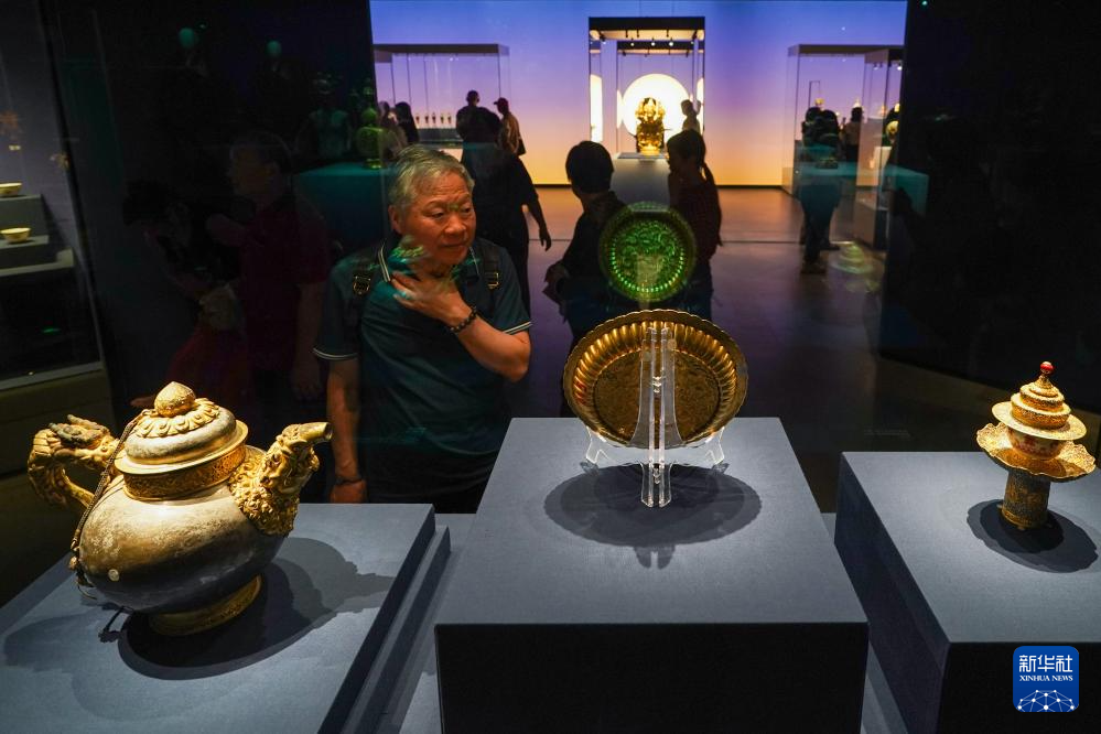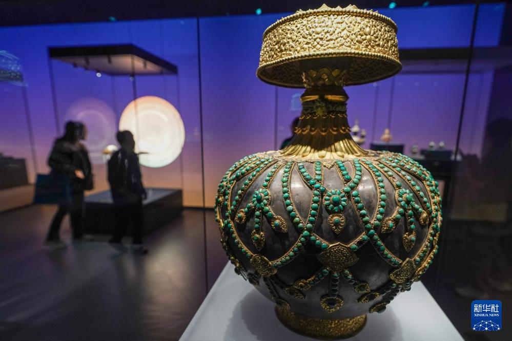 5月11日,“布達(dá)拉宮——來自雪域的世界文化遺產(chǎn)”展覽現(xiàn)場(chǎng)展出的“銀質(zhì)嵌松石瓔珞尊勝瓶”。新華社記者 李博 攝