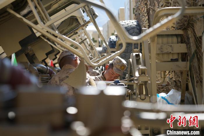 圖為某旅官兵正在對(duì)車輛傳動(dòng)軸進(jìn)行檢查維護(hù)。徐建欣 攝