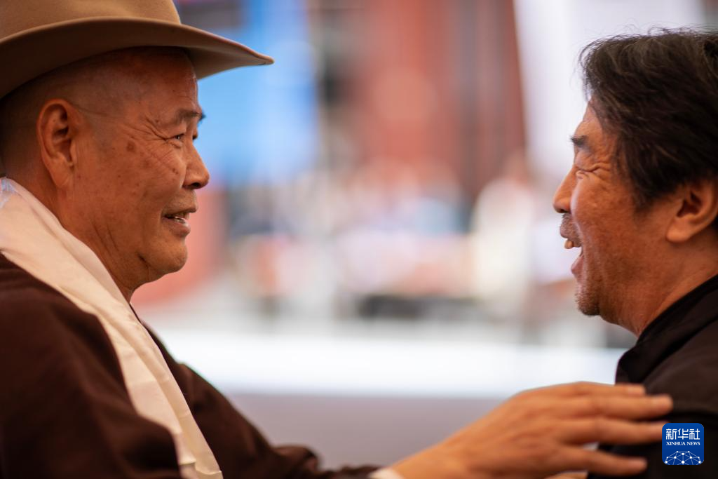 5月18日,吳雨初(左)在西藏牦牛博物館與友人交談。新華社記者 姜帆 攝