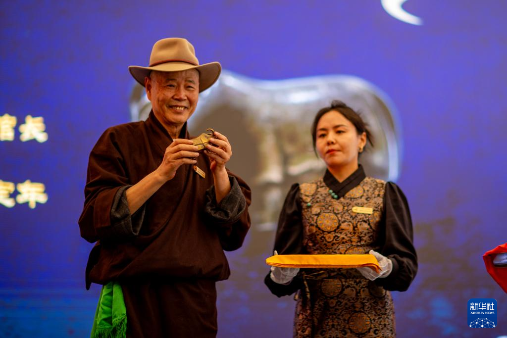 5月18日,吳雨初(左)在西藏牦牛博物館捐獻(xiàn)自己珍藏的銅牦牛文物。新華社記者 姜帆 攝