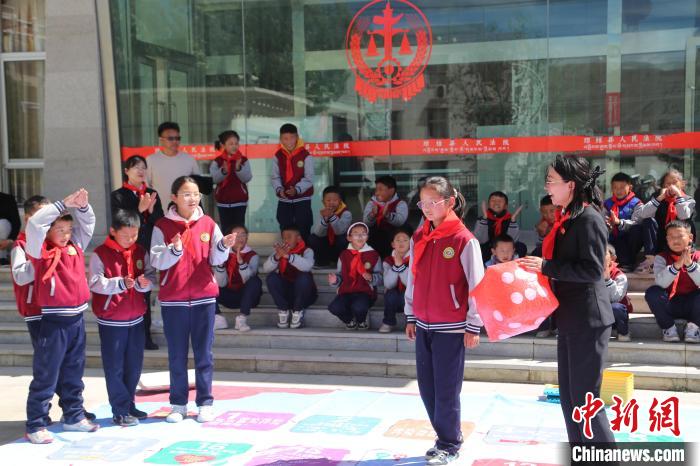 圖為學生們正在和法院干警一起參加超大棋盤游戲。倫珠澤仁攝