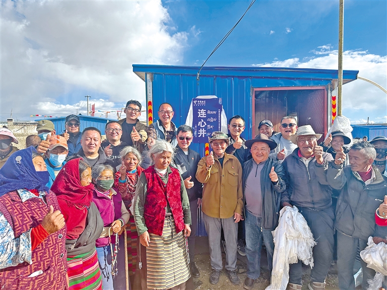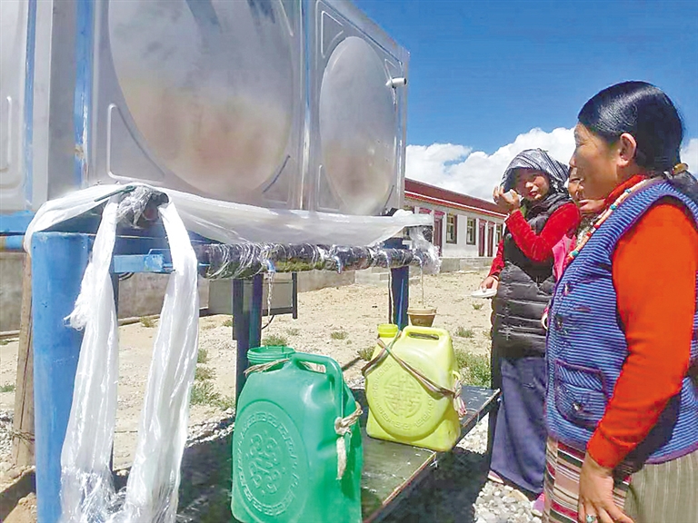 霍爾巴鄉(xiāng)群眾在中國電信西藏公司投資修建的扶貧項(xiàng)目機(jī)井取水。