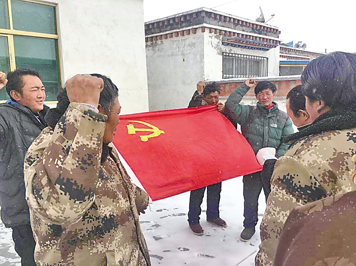 中國電信西藏公司駐霍爾巴鄉(xiāng)駐村工作隊(duì)與聯(lián)系點(diǎn)黨員干部重溫入黨宣誓。