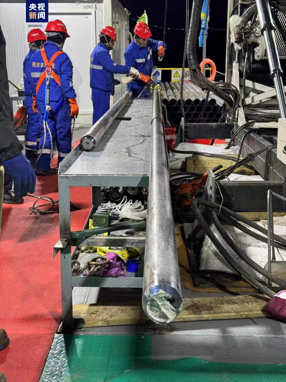 6月6日作為鉆芯的第一天,經(jīng)過(guò)不斷地調(diào)整和試驗(yàn),當(dāng)晚23時(shí)20分,第一次正式鉆探開(kāi)始,鉆頭深入到了水下95米左右的位置,在第一個(gè)點(diǎn)位開(kāi)始鉆取湖泊巖芯。23時(shí)40分,科考團(tuán)隊(duì)獲得了第一批湖泊巖心樣本??蒲袌F(tuán)隊(duì)每次鉆取3米一段,通過(guò)24小時(shí)輪班不間斷作業(yè),截至7日早6時(shí),已獲得9米長(zhǎng)的巖芯。