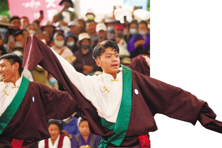 鍋莊舞又稱為“果卓”,藏語意為圓圈歌舞,2006年鍋莊舞列入第一批中國國家級非物質文化遺產(chǎn)名錄。在拉薩,鍋莊舞是當?shù)匦蓍e的一大特色。雖然決賽晚上6點才開始,但絲毫不影響市民群眾對鍋莊舞的熱愛,現(xiàn)場座無虛席,人潮涌動,不時爆發(fā)出陣陣掌聲、吶喊聲,將比賽氣氛推向高潮。
