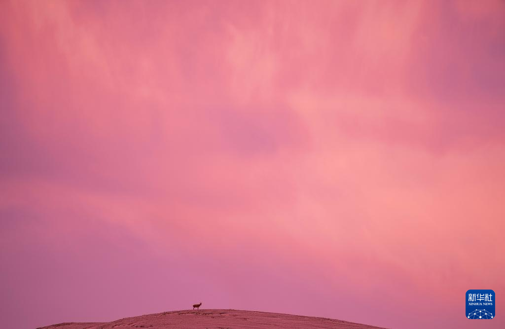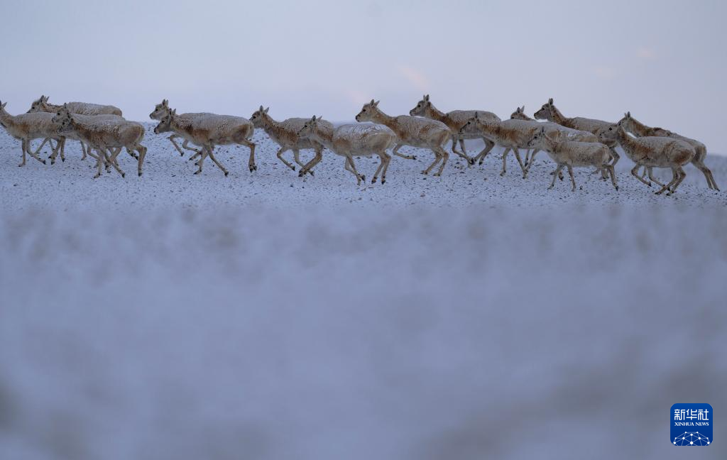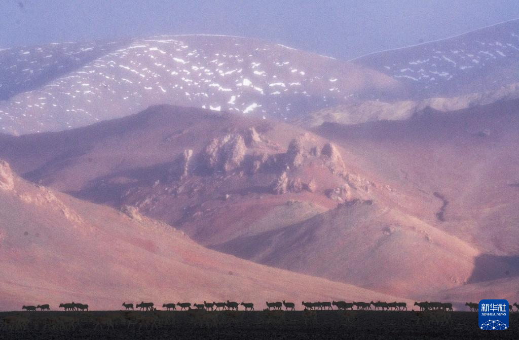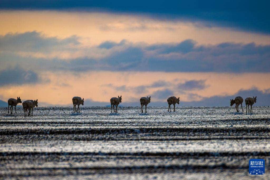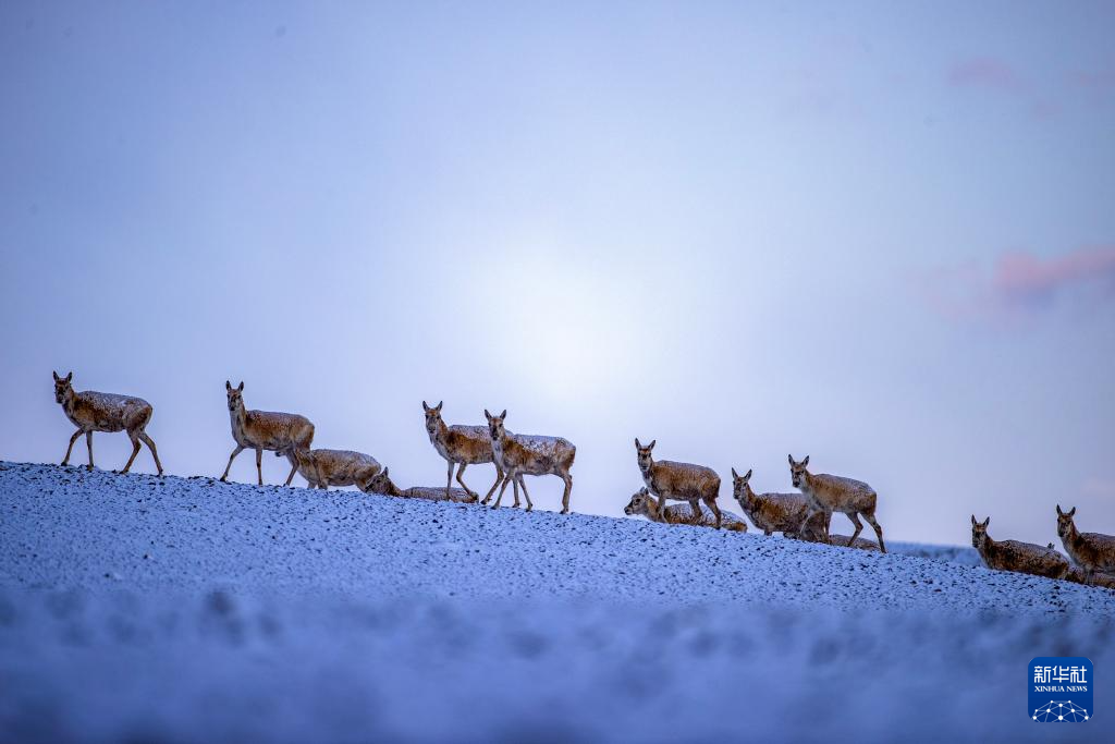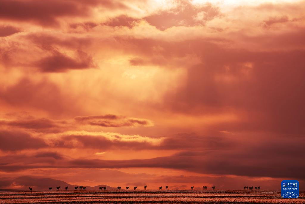 6月15日清晨雪后,在羌塘國家級自然保護區(qū),迎著朝霞前行在遷徙路上的一群藏羚羊。新華社記者 費茂華 攝