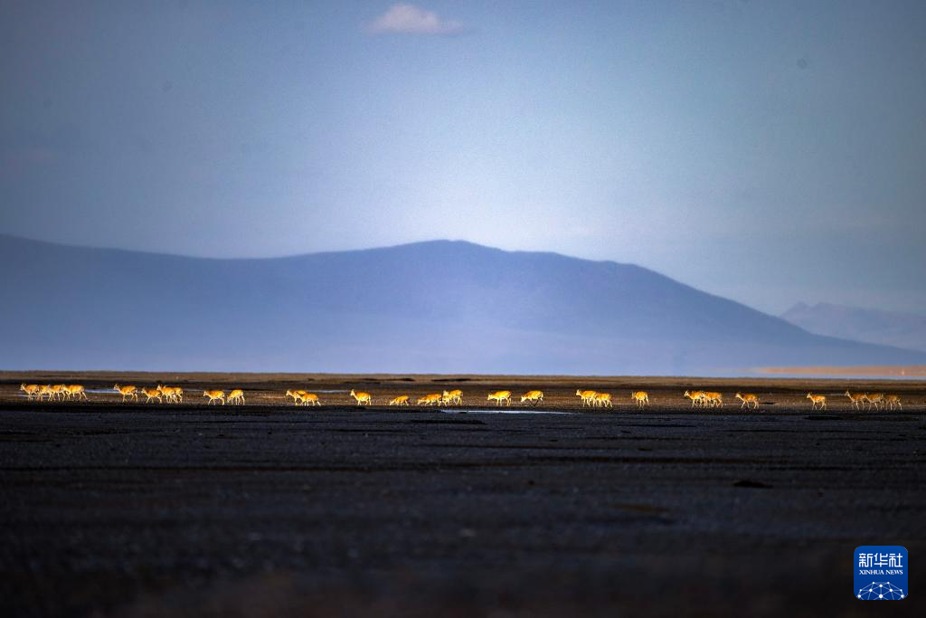 落日余暉中大群遷徙的藏羚羊行進在甜水河畔的荒灘上(6月13日攝)。新華社記者 姜帆 攝