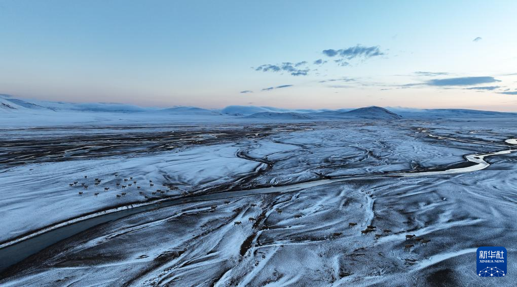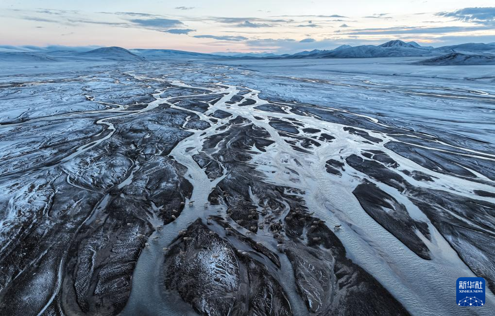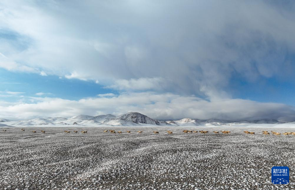 在甜水河畔荒灘雪地中向產(chǎn)羔地遷徙的藏羚羊(6月14日攝,無人機照片)。新華社記者 普布次仁 攝