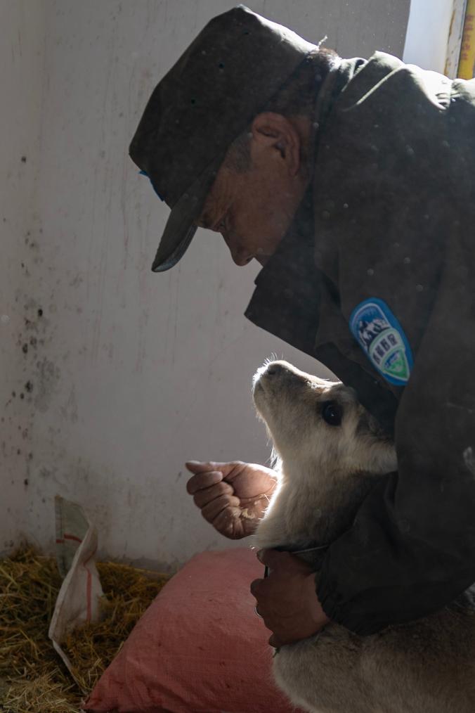 羅布玉杰站的野生動物專業(yè)管護(hù)隊員在出發(fā)巡護(hù)前給站里救護(hù)的受傷藏原羚喂糌粑(5月7日攝)。新華社記者 姜帆 攝