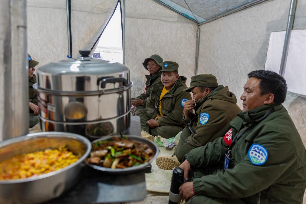 野生動物專業(yè)管護(hù)隊員們在巡護(hù)途中宿營的帳篷內(nèi)準(zhǔn)備吃飯(5月7日攝)。新華社記者 姜帆 攝