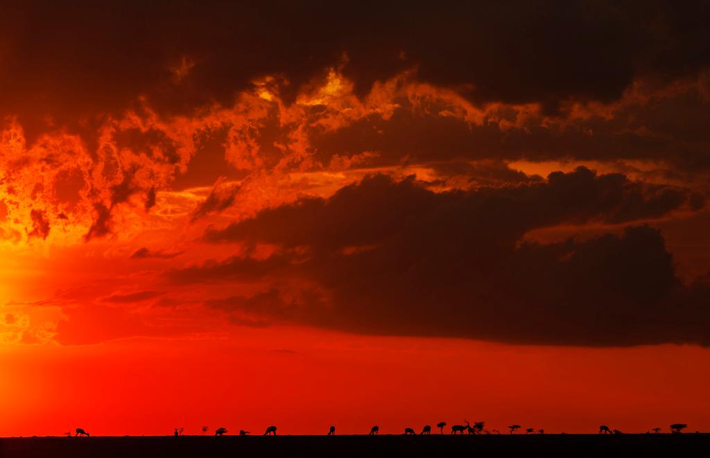 ↑ 在馬賽馬拉國家保護區(qū),遷徙中的野生動物在夕陽下覓食。
