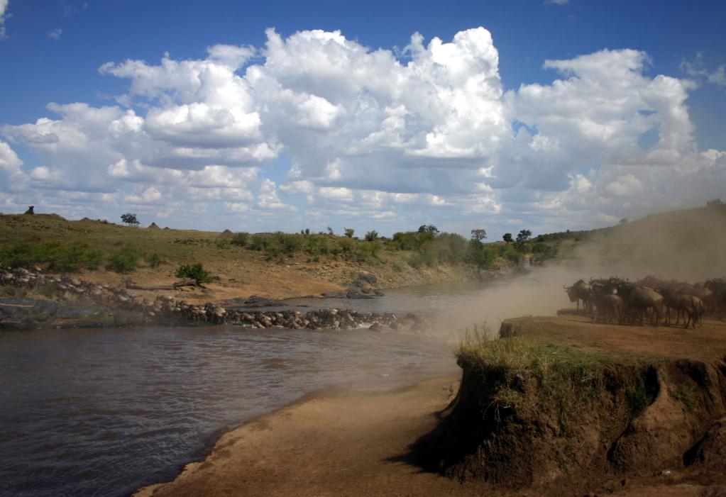 ↑ 在馬賽馬拉國家保護區(qū),遷徙中的角馬越過馬拉河。