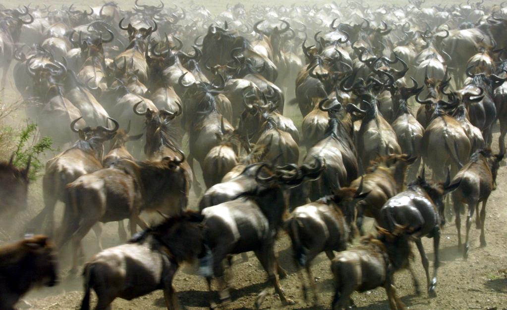 在千里之外的非洲,每年7月至9月,為了追逐水源和青草,數(shù)百萬頭角馬、斑馬和羚羊等食草動物組成一支浩浩蕩蕩的遷徙大軍,從坦桑尼亞塞倫蓋蒂國家公園向肯尼亞馬賽馬拉國家保護區(qū)遷徙,這就是東非野生動物大遷徙。當數(shù)百萬頭野生動物從面積廣闊達數(shù)萬平方公里的塞倫蓋蒂,遷徙到僅有不到2000平方公里的馬賽馬拉的時候,遷徙達到高潮。