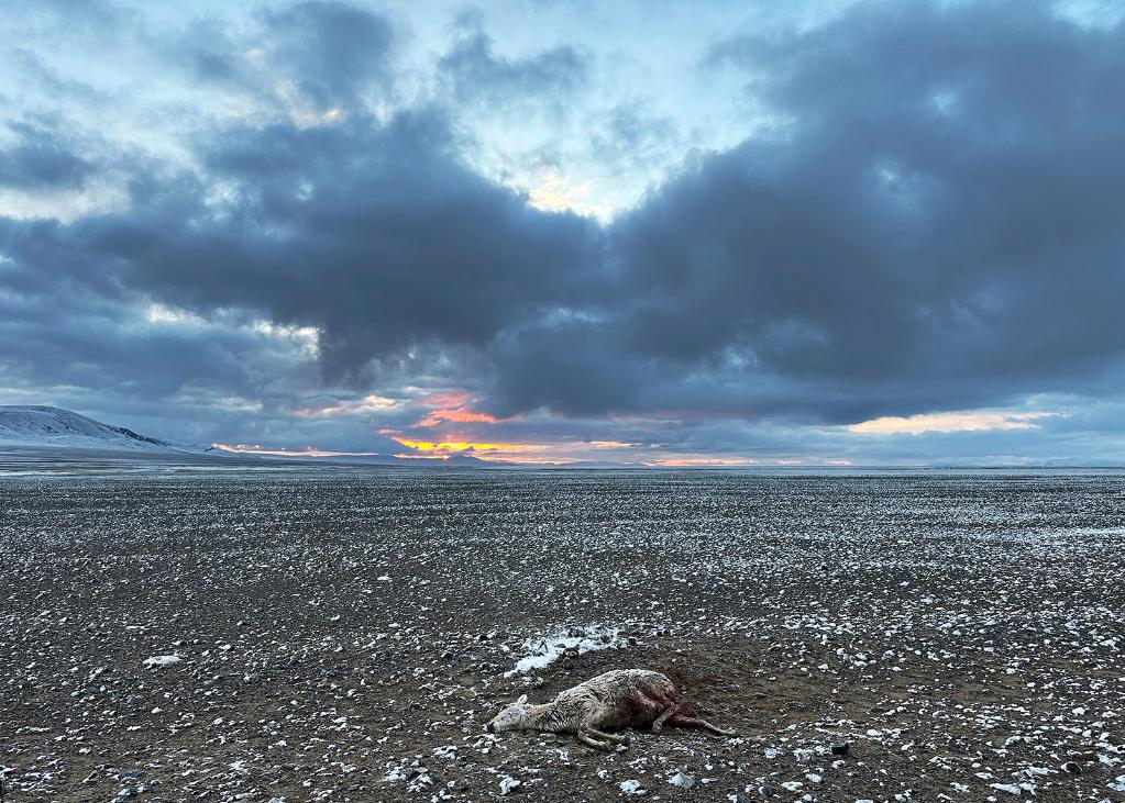 ↑ 在羌塘國家級自然保護區(qū),一只被野狼咬死的母藏羚羊躺在雪后的草原上。