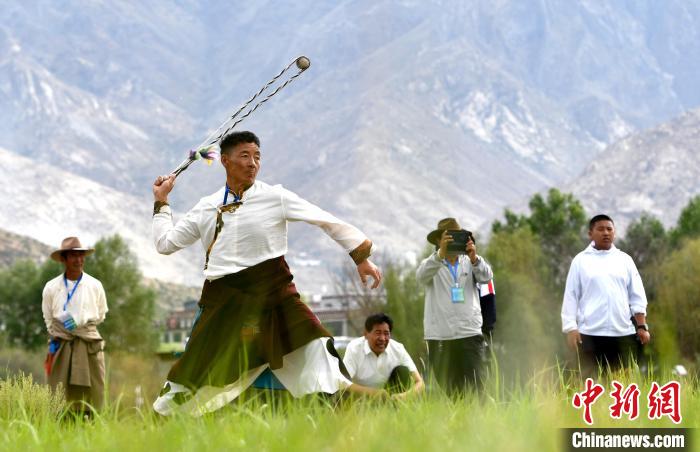 古朵指的是用牦牛毛或者山羊毛編織成的拋石繩,可以將石頭投擲到較遠(yuǎn)的地方,是牧民們用來放牧的工具。圖為6月23日拉薩首屆農(nóng)牧民運(yùn)動(dòng)會(huì)上,參賽選手正進(jìn)行古朵比賽。中新社記者 李林 攝