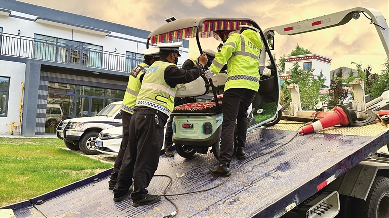 6月19日18時(shí)許,記者來(lái)到拉薩市城關(guān)區(qū)江蘇東路與嘎瑪貢桑路交叉口,此時(shí)正值下班高峰期,各類(lèi)車(chē)輛川流不息,十分繁忙,拉薩市公安局交警支隊(duì)城南大隊(duì)的民警們一邊疏導(dǎo)交通,一邊開(kāi)展電動(dòng)三輪、四輪車(chē)專(zhuān)項(xiàng)整治行動(dòng)。沒(méi)過(guò)多久,一輛電動(dòng)三輪車(chē)準(zhǔn)備通過(guò)路口,民警丹增發(fā)現(xiàn)該車(chē)輛存在非法改裝現(xiàn)象,便立即上前將車(chē)輛引導(dǎo)至安全位置,檢查后發(fā)現(xiàn)駕駛?cè)怂阶詾檐?chē)輛加裝遮陽(yáng)篷,上路行駛存在較大安全隱患,便按照相關(guān)法律法規(guī)暫扣車(chē)輛。丹增告訴記者:“我們會(huì)將暫扣的車(chē)輛統(tǒng)一停放,等駕駛?cè)私邮芴幜P并提交相關(guān)資料后,才能領(lǐng)回車(chē)輛。”