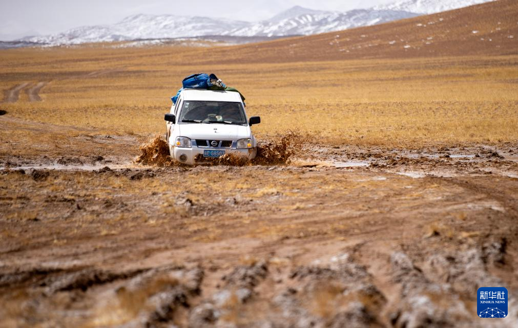 5月10日,野生動(dòng)物專業(yè)管護(hù)隊(duì)員的車子在巡護(hù)路上穿越泥濘路段。新華社記者 姜帆 攝