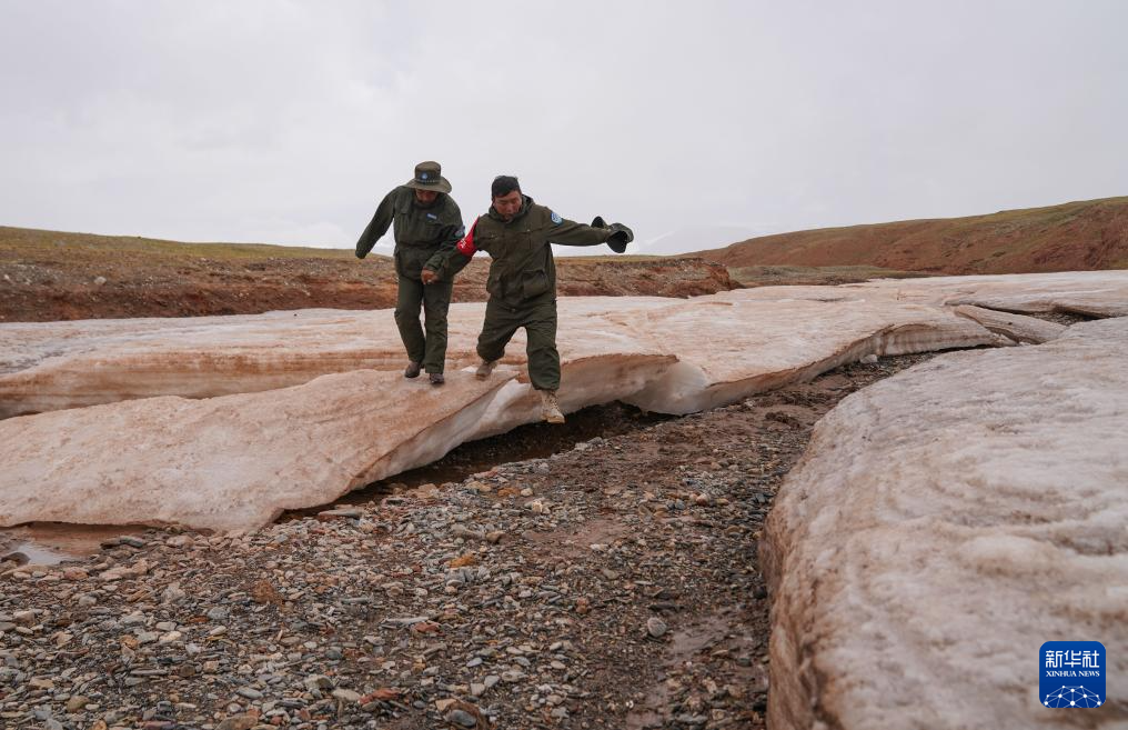 6月15日,羌塘國家級自然保護(hù)區(qū)野生動(dòng)物專業(yè)管護(hù)隊(duì)員索朗(左)和羅布檢查河面冰凍情況。新華社記者 晉美多吉 攝