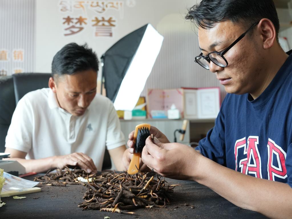羅拉(右)在公司內(nèi)清潔新鮮蟲(chóng)草(5月31日攝)。新華社記者丁汀 攝