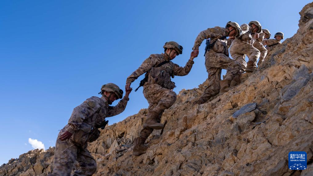 西藏阿里軍分區(qū)普爾楚邊防連秋迪儉革拉哨所巡邏官兵在巡邏途中爬越陡峭山坡(6月29日攝)。新華社發(fā)(戴學武 攝)