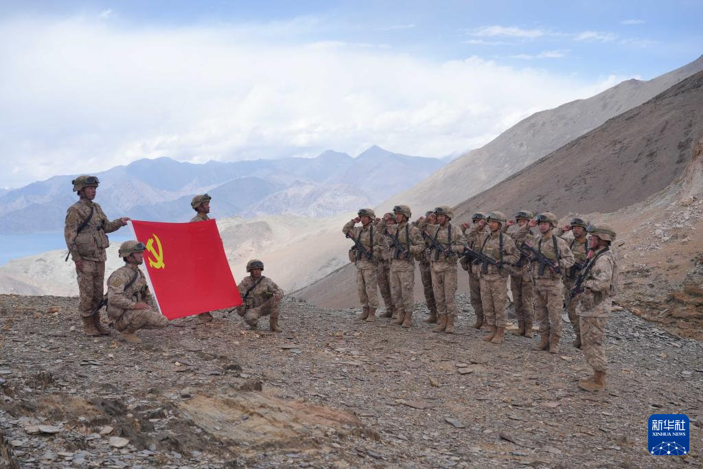 西藏阿里軍分區(qū)普爾楚邊防連秋迪儉革拉哨所巡邏官兵在海拔5700米的巡邏點位組織重溫入黨誓詞活動(6月29日攝)。新華社發(fā)(戴學武 攝)