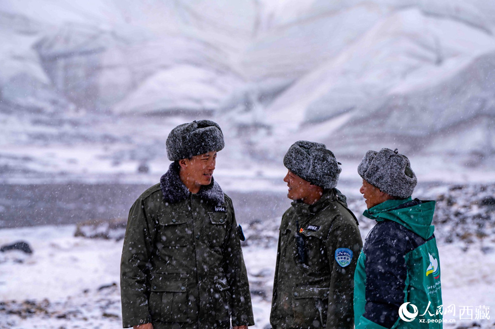 仁青加措(左一)和隊(duì)員在長(zhǎng)江源巡護(hù)交流。人民日?qǐng)?bào)記者 徐馭堯攝