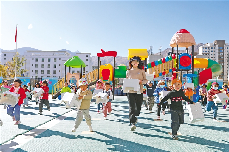 拉薩市江蘇實(shí)驗(yàn)幼兒園的孩子們與江蘇援藏老師在一起做游戲。