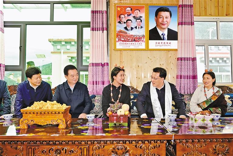 7月8日至10日,重慶市代表團(tuán)來藏考察。這是代表團(tuán)在昌都市類烏齊縣扎西貢村美麗鄉(xiāng)村示范點(diǎn)與基層群眾親切交流。 記者 旦增西旦 攝