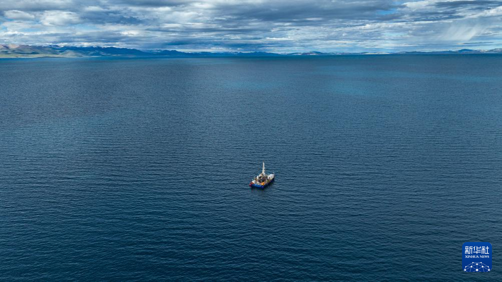 7月11日拍攝的納木錯水上鉆探平臺(無人機照片)。新華社記者 晉美多吉 攝