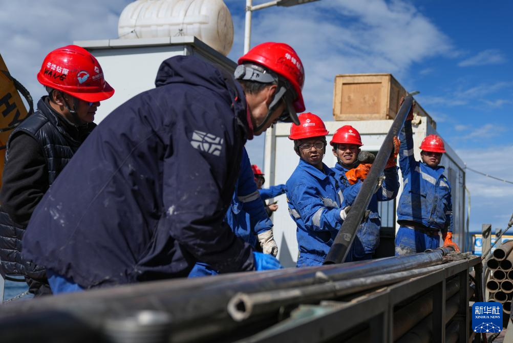 在海拔超過4700米的西藏納木錯,湖泊巖芯鉆探工作正在開展中。