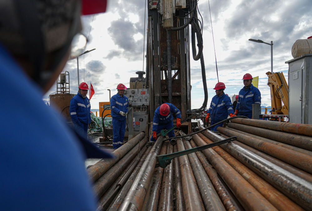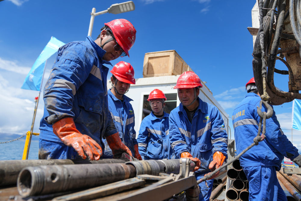 7月11日,鉆探隊隊員在準(zhǔn)備增加孔內(nèi)鉆桿。新華社記者 晉美多吉 攝