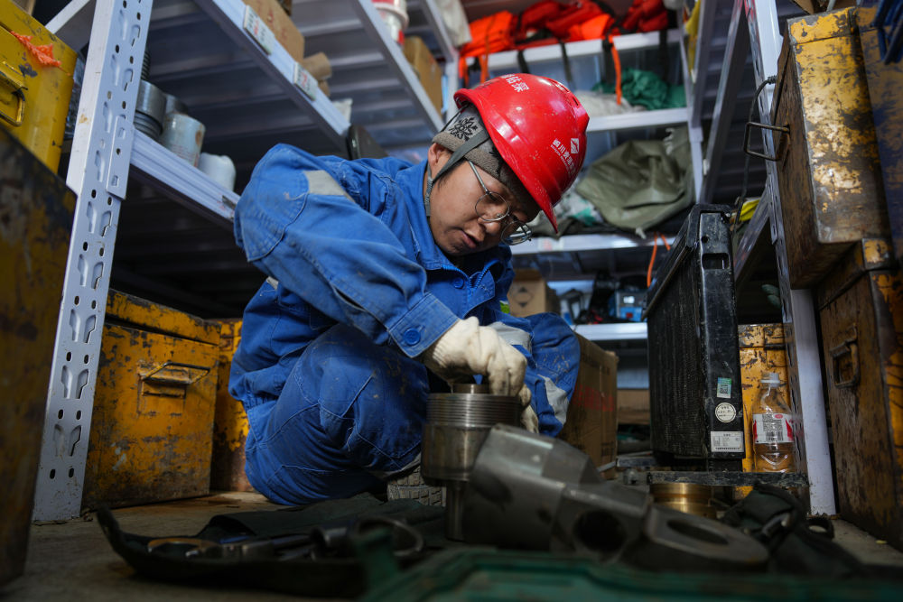 7月11日,機(jī)修工柴智敏在維修水接頭。新華社記者 晉美多吉 攝