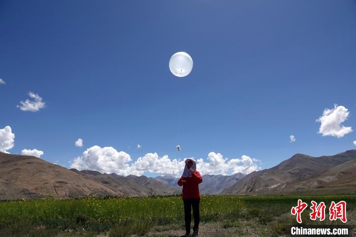 8月1日,作為二次青藏科考一項重要組成部分,珠峰地區(qū)首次開展航空平臺水-熱-碳通量觀測試驗正式啟動,圖為科考隊員施放觀測氣球。中新網(wǎng)記者 孫自法 攝