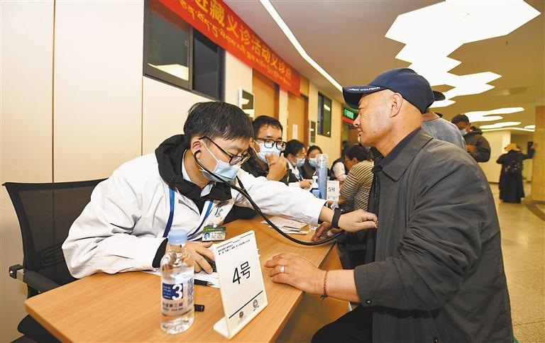 圖為醫(yī)療專(zhuān)家為就診群眾聽(tīng)診。記者 唐斌 攝