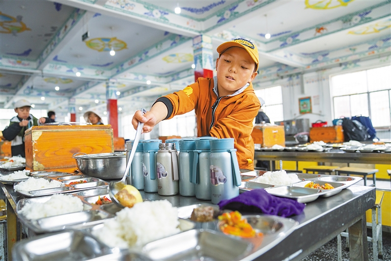 圖為那曲市班戈縣中石化小學(xué)學(xué)生在為同學(xué)們分發(fā)午餐(6月22日攝)。新華社記者 丁增尼達(dá) 攝