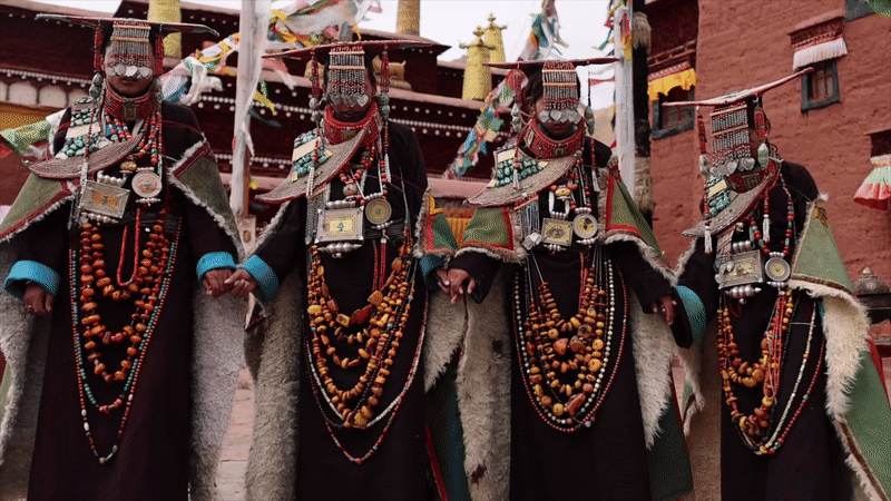 普蘭縣科迦村里有7戶人家保存著7套祖?zhèn)鞣棧惶字剡_(dá)25公斤,裝飾有黃金、白銀、松石、瑪瑙、珊瑚、珍珠等,承載和沉淀了百年時(shí)光,堪稱“穿在身上的千年史”。