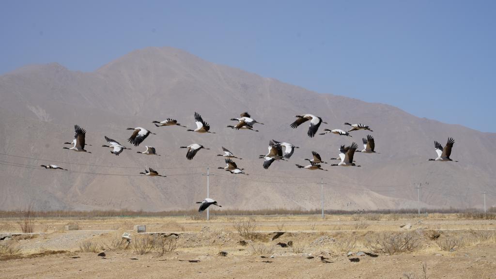 2023年12月,在雅江北岸南木林生態(tài)示范區(qū),黑頸鶴在空中自由翱翔。(受訪者供圖)
