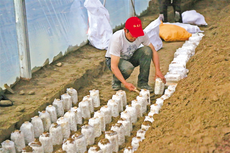 米林市米林鎮(zhèn)紅太陽家庭示范農(nóng)場的工人在埋植林芝靈芝的三級菌包。記者 謝筱純 攝