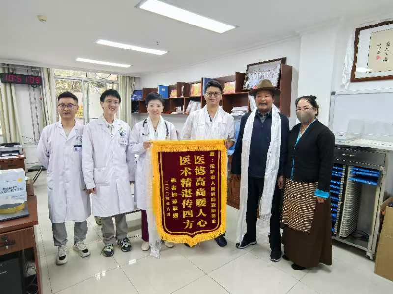 “突切囊,突切囊(非常感謝)。”患者加瓊即將離院之際,特意向主治醫(yī)生索朗和郭麗珠獻(xiàn)上哈達(dá)和錦旗。