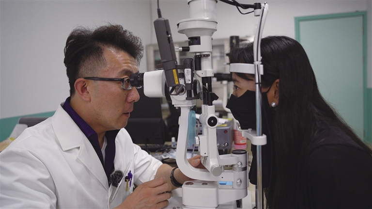 天津市第十批援藏干部、昌都市藏醫(yī)院眼科副主任醫(yī)師步紹翀開(kāi)展眼科檢查。