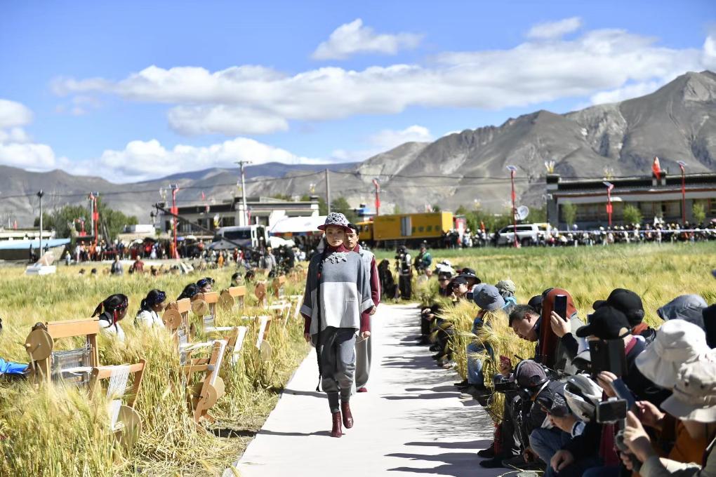田野間,新開辟出的一條上百米的S形秀道婉轉(zhuǎn)綿延。隨著富有節(jié)奏感的音樂響起,身著氆氌藏族服飾的模特款款走來(lái),一旁,30位藏族“阿佳”坐在編織機(jī)前熟練地捻織著氆氌手工品。